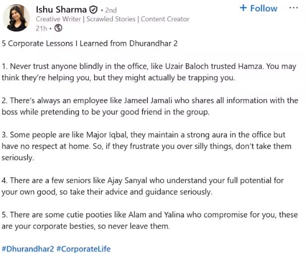 पोस्ट में '5 कॉर्पोरेट लेसन्स' के जरिए फिल्म के किरदारों को ऑफिस के अलग-अलग रोल्स से जोड़ा गया है. इसमें सबसे पहले भरोसे को लेकर चेतावनी दी गई है, जहां कहा गया कि आंख मूंदकर किसी पर भरोसा करना हमेशा सही नहीं होता, जैसा कि फिल्म में उजैर बलोच ने हमजा पर किया.