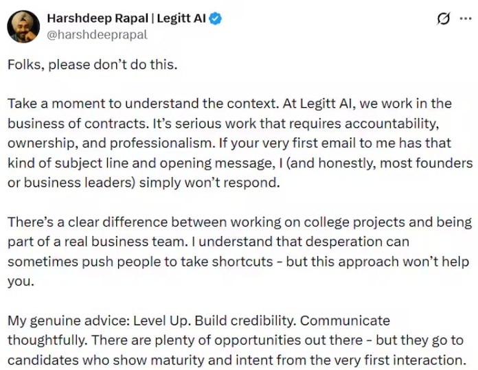 रापाल ने इस मेल का स्क्रीनशॉट X पर शेयर किया, छात्र का नाम छुपाते हुए, और साफ संदेश दिया-दोस्तों, कृपया ऐसा न करें.उन्होंने बताया कि उनकी कंपनी अनुबंधों के कारोबार में काम करती है, जो बेहद गंभीर क्षेत्र है. यहां जवाबदेही, स्वामित्व और पेशेवर रवैया सबसे अहम है. अगर पहला ईमेल ही ऐसे सब्जेक्ट और ओपनिंग मैसेज से भरा हो, तो ज्यादातर फाउंडर जवाब देना पसंद नहीं करेंगे.