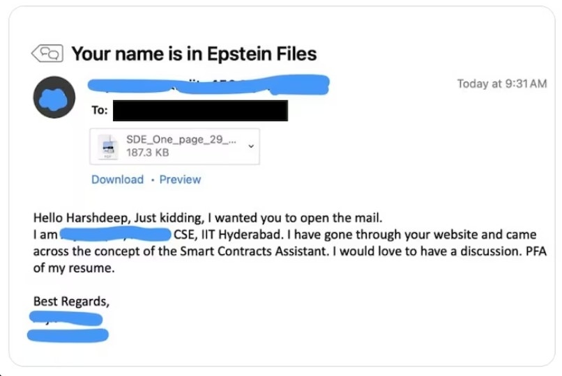 मेल भेजने वाला IIT हैदराबाद के CSE का छात्र था. उसने आगे लिखा कि उसने कंपनी की वेबसाइट देखी और खासतौर पर स्मार्ट कॉन्ट्रैक्ट्स असिस्टेंट की अवधारणा में उसकी दिलचस्पी है. उसने अपना परिचय दिया, चर्चा की इच्छा जताई और अपना रिज्यूमे भी अटैच कर दिया. मकसद साफ तौर पर पेशेवर था, लेकिन शुरुआत इतनी चौंकाने वाली थी कि वही चर्चा का केंद्र बन गई.