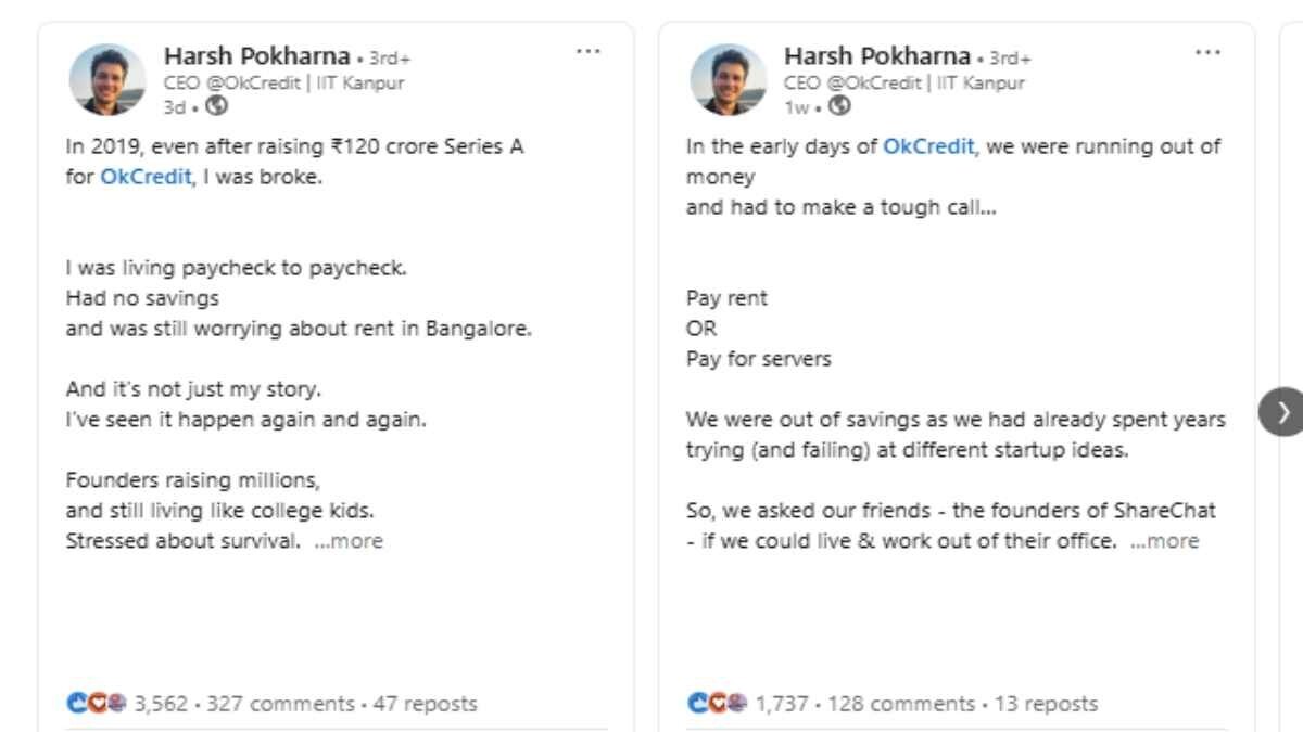 IIT से पढ़ाई के बाद स्टार्टअप के लिए करोड़ों की फंडिंग के बाद भी पैसों की तंगी झेल रहे हर्ष पोखरन की एक पोस्ट सोशल मीडिया पर काफी वायरल हो रही है. OkCredit के CEO और को-फाउंडर ने लिंक्डइन पर एक पोस्ट शेयर की है, जिसके बाद सोशल मीडिया पर स्टार्टअप्स को लेकर नई बहस शुरू हो गई है.