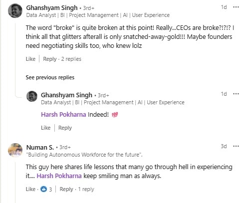 हर्ष की पोस्ट के बाद यूजर्स अपनी-अपनी प्रतिक्रियाएं दे रहे हैं. एक यूजर ने लिखा, 'क्या सीईओ सच में गरीब होते हैं? शायद फाउंडर्स को बातचीत की कला भी सीखनी चाहिए.' दूसरे यूजर ने लिखा, 'हर्ष, आप जिंदगी के सबक शेयर करते हैं, जो लोग मुश्किलों में सीखते हैं. हमेशा मुस्कुराते रहें.' एक ने लिखा, 'यह पोस्ट बहुत सच्ची है! फाउंडर की मुश्किलें, आर्थिक दबाव और सपने बनाने की जद्दोजहद को बयां करती है, हर्ष, बढ़ते रहें!' एक यूजर ने लिखा है कि फाइनेंशियल सिक्योरिटी से इच्छा नहीं बल्कि डर खत्म होता है और यही वह पार्ट है जिसके बारे में कोई बात नहीं करता.