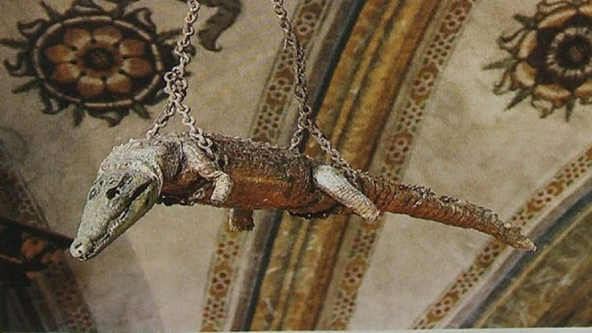 प्राचीन समय में, ईसाई धर्म सांप, ड्रेगन और मगरमच्छ जैसे रैपटाइल्स को बुराई से जोड़ता था, या तो शैतान के अवतार के रूप में या बस ऐसे जानवरों के रूप में जो मनुष्यों को पाप की ओर ले जाते हैं. इसलिए इसे चर्च में ऊपर जंजीर से बांधना न केवल चर्च जाने वालों के लिए एक चेतावनी के रूप में, बल्कि बुराई पर अच्छाई की जीत के प्रतीक के रूप में भी काम करता है.