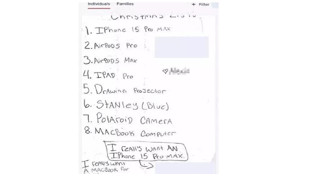 आम तौर पर बच्चे अपनी विश लिस्ट में खास खिलौने या साइकिल या किड स्कूटर जैसी चीजें मांगते हैं. लेकिन हाल में रेडिट पर वायरल हुई एक बच्ची की विश लिस्ट में उसने जो कुछ मांगा वह हैरान करने वाला था. इसमें महंगी इलैक्ट्रॉनिक चीजों की लंबी लिस्ट थी. इसमें लिखा था- iPhone 15 Pro Max, iPad, and AirPods, Macbook computer, Polaroid camera, Drawing projector आदि. ये सारी ही चीजें इतनी ज्यादा कीमती हैं कि बच्ची की ये विश लिस्ट देखकर लोग हैरान हैं.