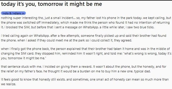 रेडिट यूजर ने लिखा कि उनके पिता का फोन पार्क में गिर गया था. उन्होंने बार-बार कॉल करने की कोशिश की, लेकिन फोन तुरंत स्विच ऑफ कर दिया गया. इससे उन्हें लगा कि जिसने फोन उठाया है, उसका इरादा इसे लौटाने का नहीं है. मजबूरी में उन्होंने सिम कार्ड ब्लॉक कर दिया, लेकिन उससे पहले व्हाट्सएप पर एक संदेश भेज दिया. थोड़ी देर बाद उन्हें दिखाई दिया कि संदेश पर ब्लू टिक लग चुके हैं.