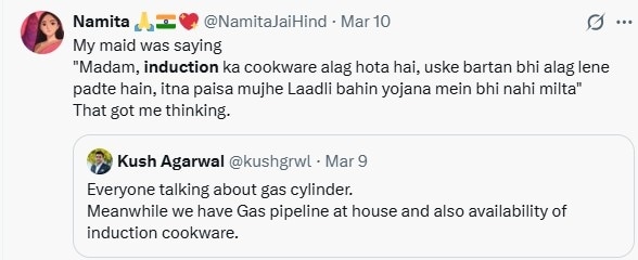 देश के कई हिस्सों में कमर्शियल LPG सिलेंडर की कमी और सप्लाई में रुकावट के बीच इंडक्शन कुकटॉप की मांग बढ़ गई है. इसका असर सोशल मीडिया पर भी देखने को मिल रहा है. सोशल मीडिया प्लेटफॉर्म X पर इंडक्शन हैशटैग ट्रेंड कर रहा है और इस पर कई दिलचस्प व मजेदार मीम्स सामने आ रहे हैं.