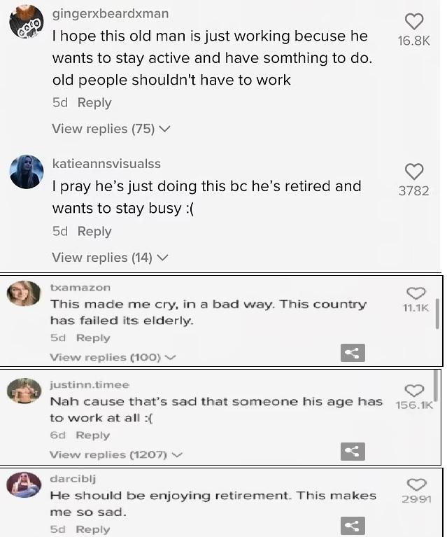 वहीं एनाबेल के इस कदम की टिकटॉक पर जमकर तारीफ कर रहे है. कई लोगों ने कहा कि उनको अब रिटायर हो जाना चाहिए. वहीं एक शख्स ने लिखा कि अब उनकी उम्र काम करने की नहीं है. वहीं कुछ लोगों ने कहा कि ये शख्स खुद को फिट रखना चाहता है, इसलिए काम कर रहा है. वहीं एक व्यक्ति ने लिखा कि ये देखकर दुख होता है, हमें अपने बुजुर्गों के साथ अच्छा व्यवहार करना चाहिए.