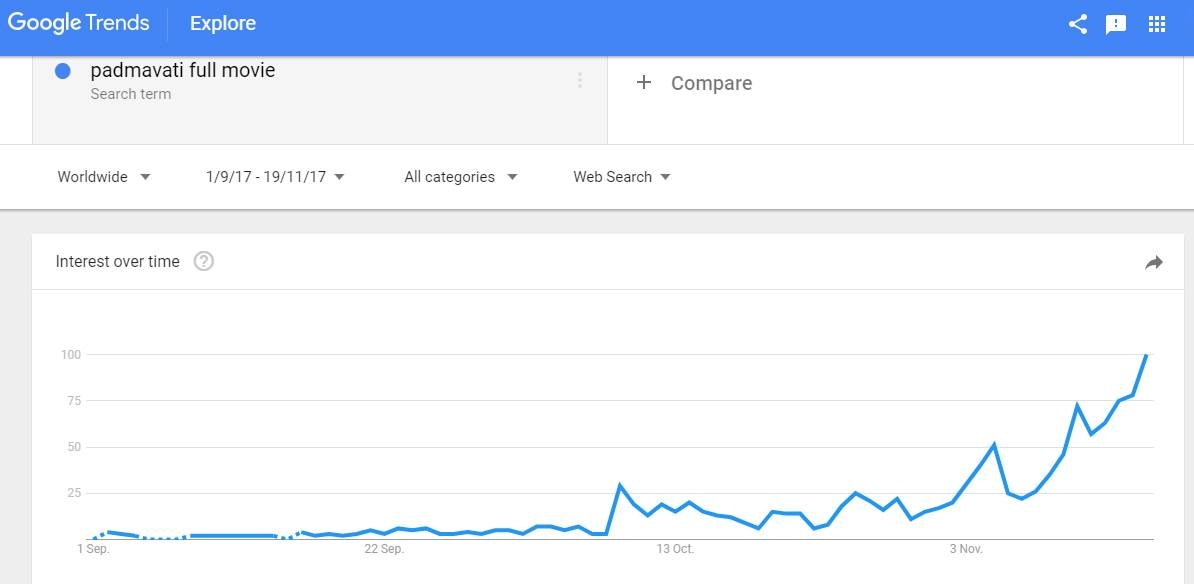 गूगल ट्रेंड पर अगर चेक करें तो एक अक्टूबर से ही Padmavati full Movie कीवर्ड को लोग सर्च कर रहे हैं. लेकिन 12 नवंबर से 18 नवंबर के बीच इस कीवर्ड से सर्च करने वालों की संख्या काफी अधिक बढ़ गई है.