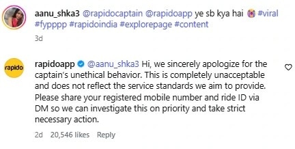 मामला सामने आने के बाद रैपिडो ने इस पर प्रतिक्रिया दी. कंपनी ने अपने आधिकारिक बयान में इस व्यवहार को “अनैतिक” और “पूरी तरह अस्वीकार्य” बताया और सार्वजनिक रूप से माफी मांगी.
