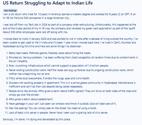Reddit पर वो लिखते हैं कि मैं जनवरी 2024 में भारत लौटा और अपने देश में फिर से बसने को लेकर उत्साहित था, लेकिन एक साल हो गया है और अब तक मैं एडजस्ट नहीं कर पाया हूं.