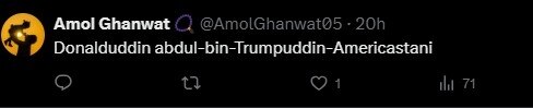 वीडियो में ट्रंप के शपथ ग्रहण समारोह की एक क्लिप भी जोड़ी गई है, जिसमें वे प्रार्थना सभा में मुस्लिम अजान को ध्यान से सुनते दिखाई दे रहे हैं.इस वीडियो पर मजेदार कमेंट भी आए. किसी ने उन्हें 'डोनाल्ड खान' कहा, तो किसी ने लिखा 'डोनाल्ड बिन ट्रंप'. एक यूजर ने तो ट्रंप की मुस्लिम टोपी पहने फोटो भी शेयर की.