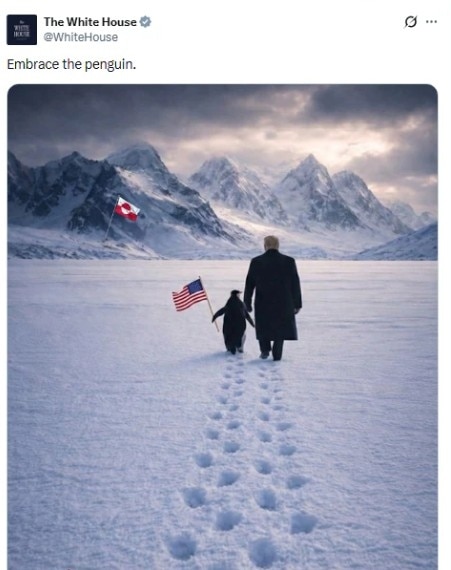 व्हाइट हाउस ने ग्रीनलैंड में ट्रंप को एक पेंगुइन संग चलते दिखाती AI तस्वीर साझा की (Photo: White House/X)