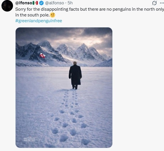 कुछ यूजर्स ने यह भी नोटिस किया कि ट्रंप के पीछे दिखाई दे रहे पैरों के निशान इंसानों जैसे लग ही नहीं रहे थे. एक शख्स ने व्यंग्य में लिखा कि अच्छी कोशिश है, लेकिन ग्रीनलैंड में पेंगुइन मिलते ही नहीं.
