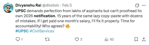 सालों तक एसे और एथिक्स पेपर के लिए भाषा और व्याकरण सुधारने वाले अभ्यर्थियों के लिए UPSC के आधिकारिक दस्तावेज में इतनी बेसिक स्पेलिंग गलतियां मिलना बेहद अजीब लगा.UPSC की प्रतिष्ठा को देखते हुए अभ्यर्थियों का कहना है कि यह केवल टाइपो नहीं, बल्कि संस्थागत अनुशासन की कमी दर्शाता है.