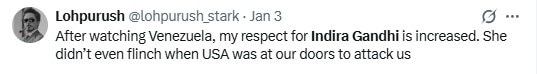 लौहपुरुष नाम के एक यूजर ने लिखा है, "वेनेजुएला को देखने के बाद इंदिरा गांधी के लिए मेरा सम्मान और बढ़ गया है. जब अमेरिका हम पर हमला करने के लिए हमारे दरवाजे पर था, तब भी वह बिल्कुल नहीं घबराईं."