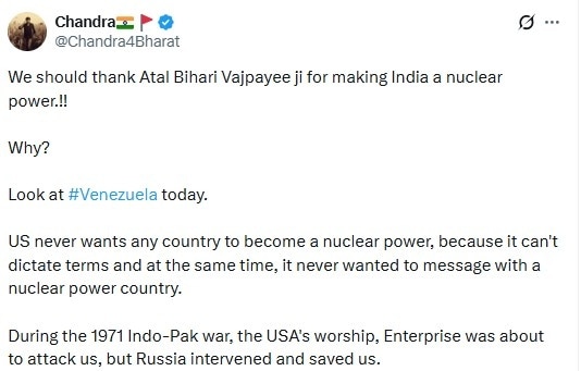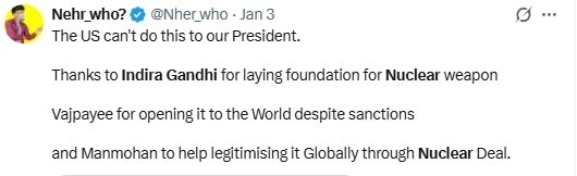 एक दूसरे यूजर ने वेनेजुएला की घटना पर प्रतिक्रिया देते हुए एक्स पर लिखा है, "न्यूक्लियर हथियार की नींव रखने के लिए इंदिरा गांधी का धन्यवाद. प्रतिबंधों के बावजूद इसे दुनिया के लिए खोलने के लिए वाजपेयी का धन्यवाद, और न्यूक्लियर डील के ज़रिए इसे दुनिया भर में मान्यता दिलाने में मदद करने के लिए मनमोहन का धन्यवाद."