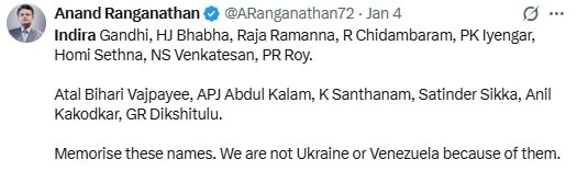जाने माने डिबेटर आनंद रंगनाथन ने यूक्रेन की घटना पर प्रतिक्रिया देते हुए एक्स पर लिखा है, " इंदिरा गांधी, एचजे भाभा, राजा रमन्ना, आर चिदंबरम, पीके अयंगर, होमी सेठना, एनएस वेंकटेशन, पीआर रॉय.