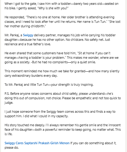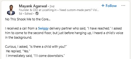 गुरुग्राम स्थित एक कंपनी के सीईओ मयंक अग्रवाल ने यह किस्सा अपने पोस्ट में शेयर किया. उन्होंने बताया कि उन्होंने एक दिन खाना मंगवाया था और डिलीवरी बॉय को कॉल कर दूसरी मंजिल तक आने को कहा. लेकिन कॉल कटते ही उन्हें फोन के पीछे से एक बच्चे की आवाज सुनाई दी. जब उन्होंने पूछा तो डिलीवरी एजेंट ने बताया कि उनकी बेटी उनके साथ है. यह सुनते ही मयंक खुद नीचे चले आए.