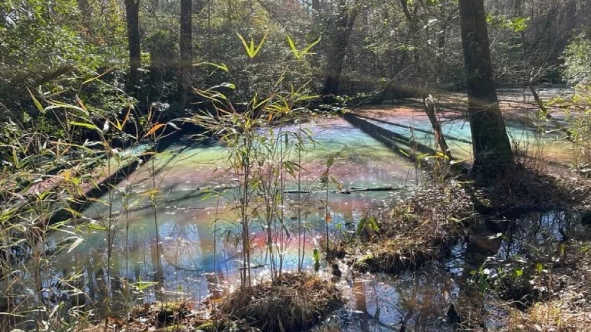 ग्रेट डिसमल दलदल दक्षिणपूर्वी वर्जीनिया और उत्तरपूर्वी उत्तरी कैरोलिना में लगभग 750 वर्ग मील के क्षेत्र में फैला हुआ है. तस्वीर में दलदल में पानी का एक असामान्य पूल दिख रहा है जिसमें नीले और हरे से लेकर पीले और लाल तक सुंदर रंग शामिल हैं. यह फेनोमेनन, जिसे उपयुक्त रूप से "रेनबो पूल" कहा जाता है, केवल विशिष्ट परिस्थितियों में ही होती है.