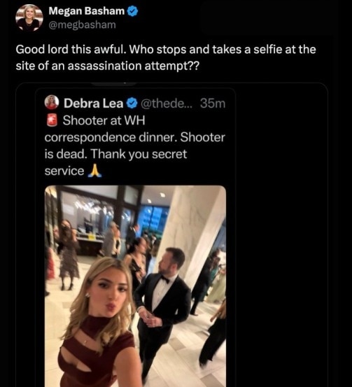 डेब्रा ली (कंजर्वेटिव सोशल मीडिया इन्फ्लुएंसर) ने गोलीबारी के तुरंत बाद सेल्फी पोस्ट की थी. उसमें वह ‘किसी फेस’ (मुंह बनाकर) सेल्फी लेते हुए नजर आईं, जबकि बैकग्राउंड में स्थिति अभी भी तनावपूर्ण थी. उन्होंने यह दावा भी किया कि शूटर मर गया है, जो बाद में गलत साबित हुआ क्योंकि उसे गिरफ्तार किया गया था.
