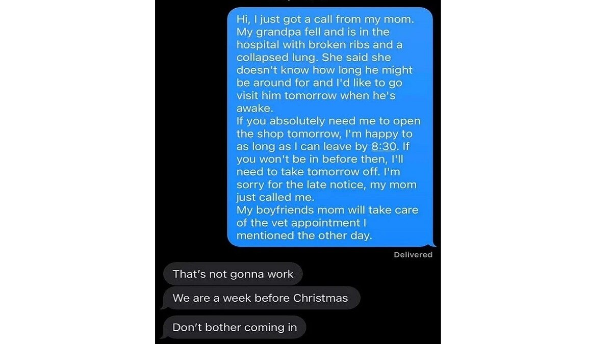 उसने आगे लिखा- रही बार वेट अप्वाइंटमेंट की जिसके बारे में मैंने पहले बताया था तो वहां मेरे बॉयफ्रेंड की मां चली जाएंगी क्योंकि मुझे अचानक दादा जी के पास जाना पड़ रहा है. वहीं जेना के बॉस ने जो जवाब दिया उससे लोग हैरान रह गए. उसने दादा जी के हाल पर जरा भी सहानुभूति जाहिर नहीं की बल्कि जवाब में लिखा- 'ऐसे काम नहीं चलेगा, क्रिसमस को बस एक सप्ताह ही बचा है. एक काम करो तुम आने की तकलीफ ही मत उठाना.'