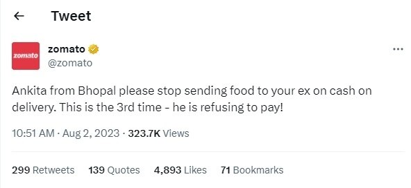 जोमैटो ने अपने ट्वीट में लिखा- भोपाल से अंकिता कृपया अपने एक्स-बॉयफ्रेंड को कैश ऑन डिलीवरी पर खाना भेजना बंद करें. यह तीसरी बार है जब वो पेमेंट करने से इनकार कर रहा है.