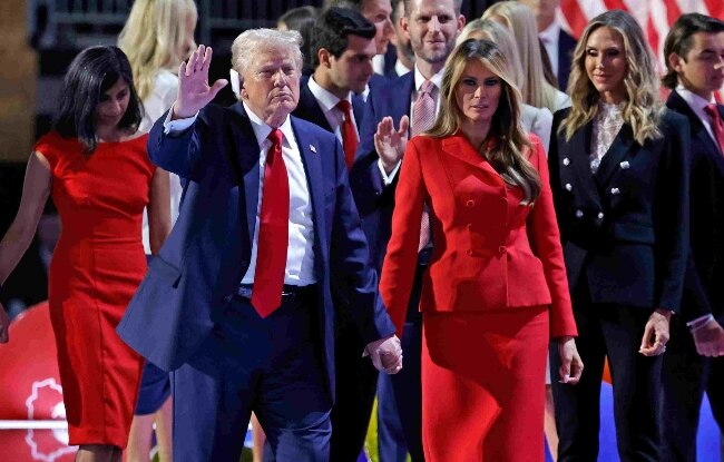 रिपब्लिकन पार्टी के राष्ट्रपति पद के उम्मीदवार ट्रंप ने व्हाइट शर्ट के साथ बिना टाई वाला नेवी ब्लू सूट पहना था. ट्रंप ने लाल रंग की MAGA (मेक अमेरिका ग्रेट अगेन) कैप भी पहनी थी, लेकिन मेलानिया MAGA कैप में नजर नहीं आईं.