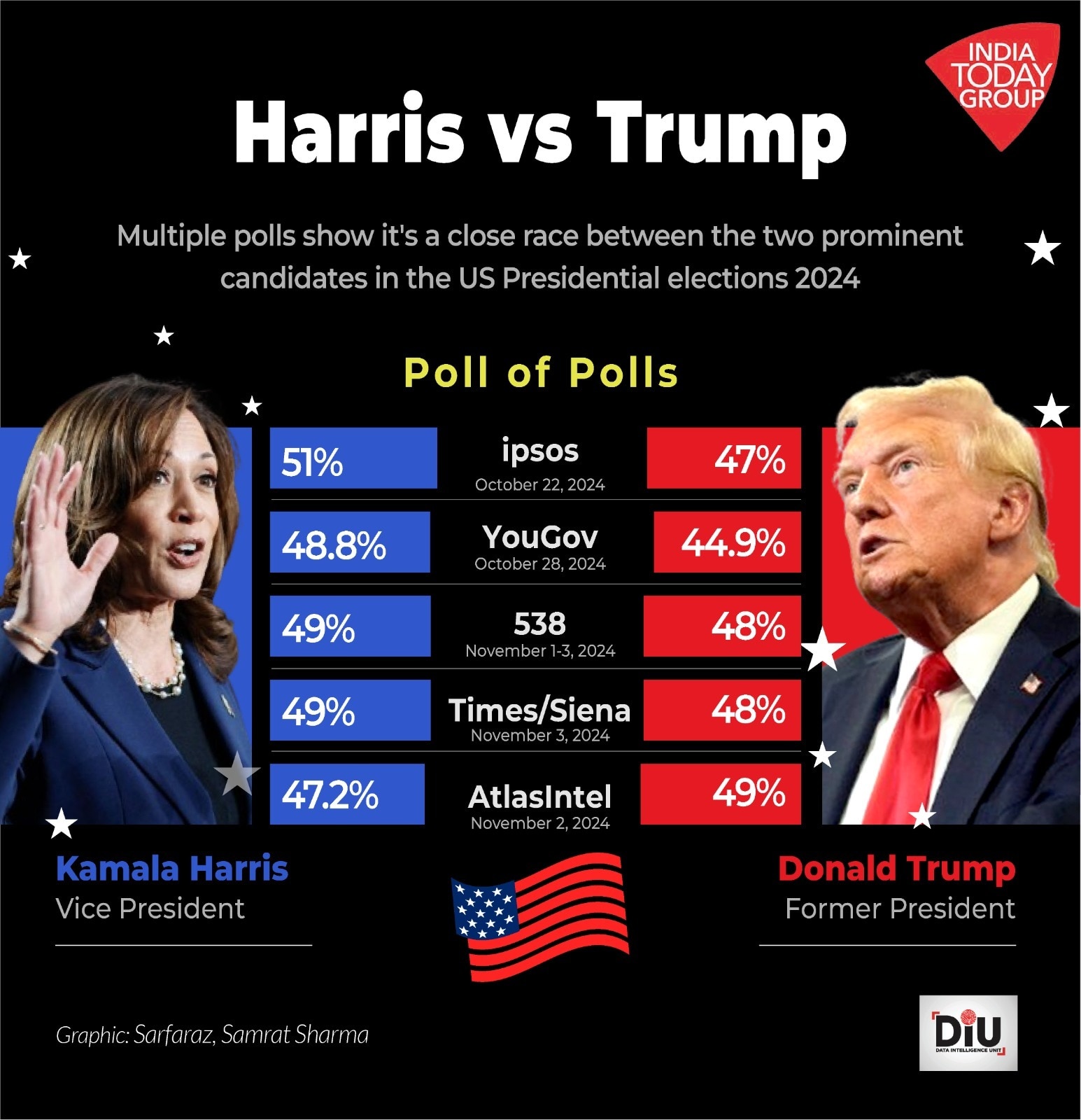 अमेरिकी राष्ट्रपति चुनाव 5 नवंबर को होंगे, जिसके अगले दिन वोटों की गिनती होगी. यहां विभिन्न सर्वेक्षणों से मतदाताओं के रुझान को आसानी से समझा जा सकता है कि कमला हैरिस और ट्रम्प में कौन आगे चल रहा है. बता दें कि ipsos के सर्वे में कमला हैरिस आगे चल रही हैं. जबकि ट्रंप पीछे चल रहे हैं. कमला हैरिस को 51 फीसदी जबकि ट्रंप को 47 फीसदी लोगों का समर्थन मिलता दिख रहा है. वहीं, YouGov के सर्वे में कमला हैरिस 48.8 फीसदी के साथ आगे चल रही हैं, जबकि ट्रंप 44.9 फीसदी पर हैं, 538 के सर्वे में कमला हैरिस 49 फीसदी, जबकि ट्रंप 48 फीसदी, Times/Siena के सर्वे में कमला हैरिस को 49 फीसदी तो ट्रंप को 48 फीसदी लोगों का समर्थन मिलता दिख रहा है, वहीं Atlaslntel के सर्वे में कमला हैरिस को 47.2 फीसदी तो ट्रंप को 49 फीसदी लोगों का समर्थन मिल सकता है.