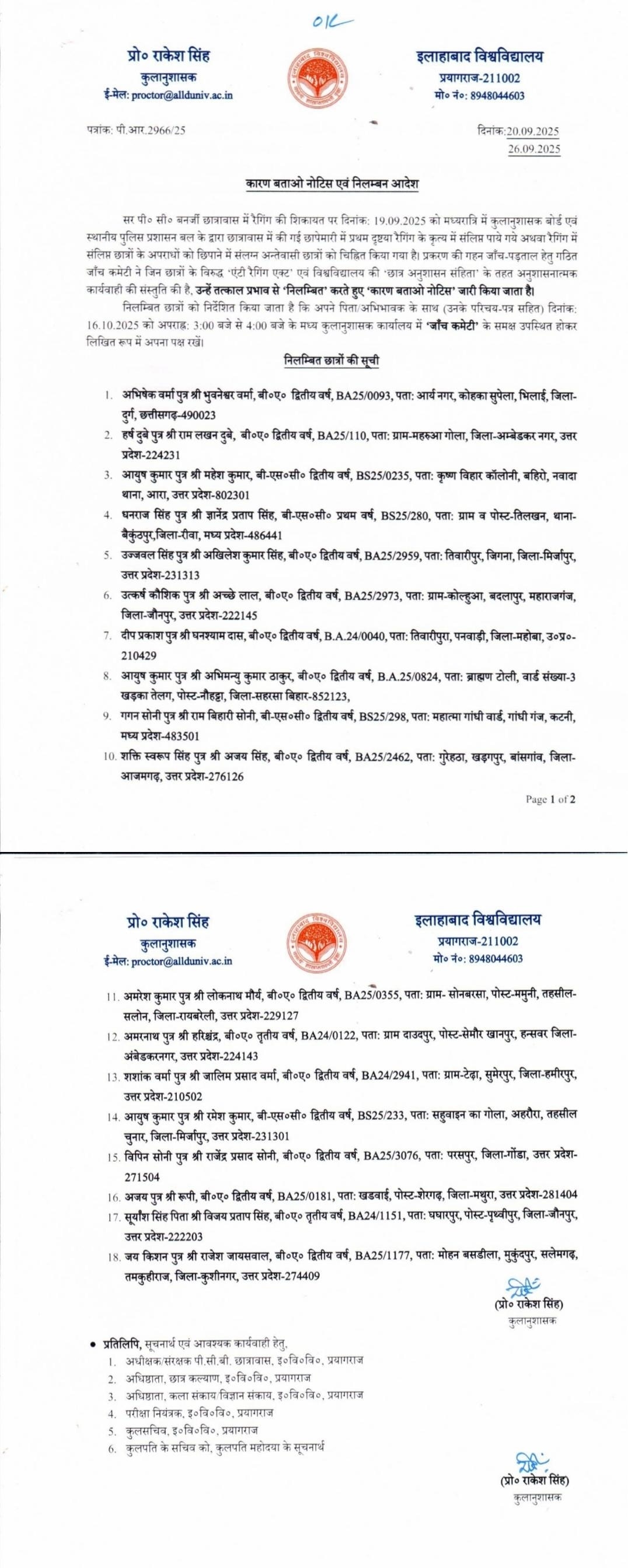 शिकायत के बाद प्रॉक्टर कार्यालय ने सख्ती दिखाते हुए इन छात्रों को निलंबित किया है - अभिषेक वर्मा (बी.ए. द्वितीय वर्ष), हर्ष दुबे (बी.ए. द्वितीय वर्ष), आयुष कुमार (बी.एस.सी. द्वितीय वर्ष), धनराज सिंह (बी.एस.सी. प्रथम वर्ष), उज्जवल सिंह (बी.ए. द्वितीय वर्ष), उत्कर्ष कौशिक (बी.ए. तृतीय वर्ष), दीप प्रकाश (बी.ए. द्वितीय वर्ष), आयुष कुमार (बी.ए. द्वितीय वर्ष), गगन सोनी (बी.एस.सी. द्वितीय वर्ष), शक्ति स्वरूप (बी.ए. द्वितीय वर्ष), अमरेश कुमार (बी.ए. द्वितीय वर्ष), अमरनाथ (बी.ए. तृतीय वर्ष), शशांक वर्मा (बी.ए. द्वितीय वर्ष), आयुष कुमार (बी.एस.सी. द्वितीय वर्ष), विपिन सोनी (बी.ए. द्वितीय वर्ष), अजय (बी.ए. द्वितीय वर्ष), सूर्यांश सिंह (बी.ए. तृतीय वर्ष) और जय किशन (बी.ए. द्वितीय वर्ष).
