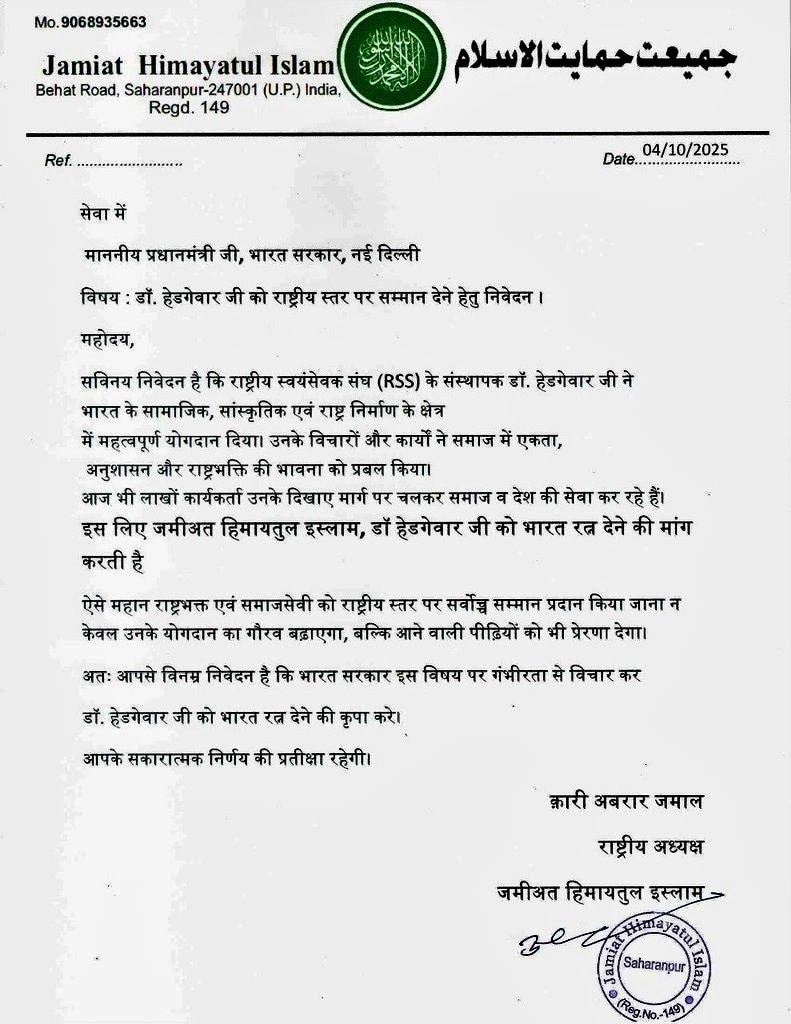 आपको बता दें कि जमीयत हिमायतुल इस्लाम के अध्यक्ष अबरार जमाल ने प्रधानमंत्री मोदी को पत्र भेजकर राष्ट्रीय स्वयंसेवक संघ (RSS) के संस्थापक डॉ. केशव बलिराम हेडगेवार को भारत रत्न देने की मांग की है. यह मांग सहारनपुर में उनके संगठन के लेटरहेड पर जारी पत्र के माध्यम से की गई है. जमाल का कहना है कि डॉ. हेडगेवार ने भारत के सामाजिक, सांस्कृतिक और राष्ट्र निर्माण के क्षेत्र में अतुलनीय योगदान दिया. उनके विचारों ने समाज में एकता, अनुशासन और राष्ट्रभक्ति की भावना को मजबूत किया. अबरार जमाल ने पत्र में सरकार से इस मांग पर गंभीरता से विचार करने का आग्रह किया है.