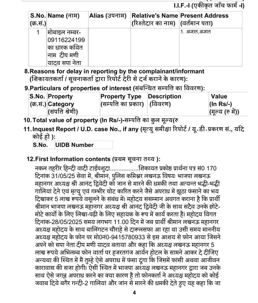 एफआईआर में आरोपी के मोबाइल नंबर 09116224199 का जिक्र किया गया है और पुलिस से मांग की गई है कि संबंधित नंबर और व्यक्ति की गहनता से जांच कर दोषियों के खिलाफ उचित कार्रवाई की जाए.
