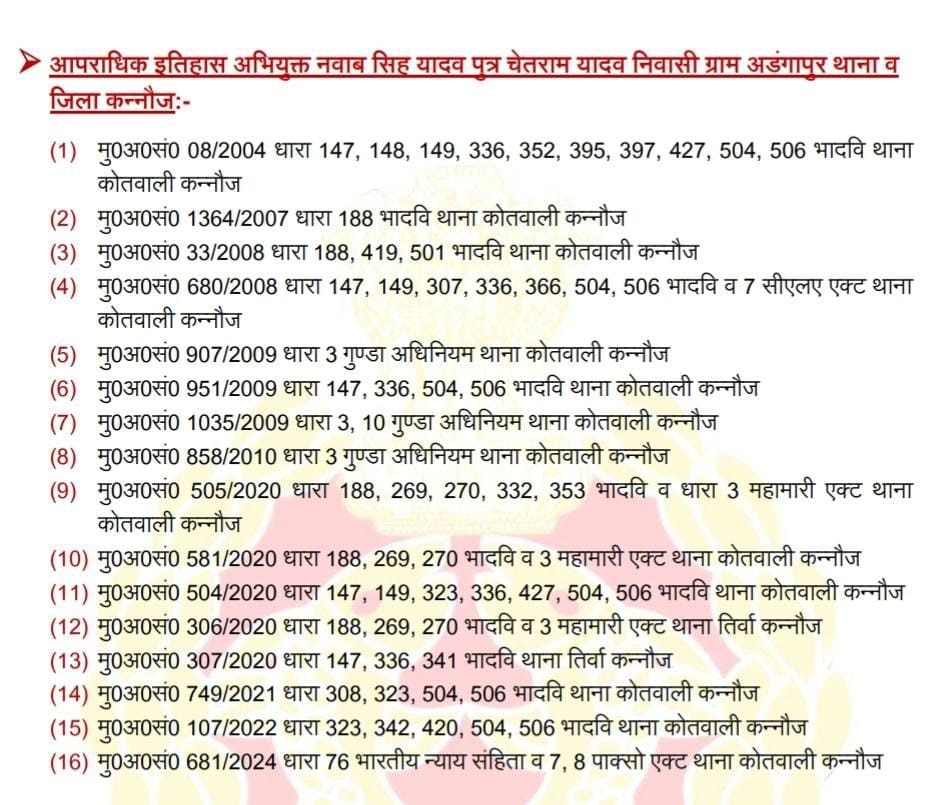 नवाब सिंह यादव को सोमवार को पुलिस ने गिरफ्तार कर जेल भेजा है. कहा जा रहा है कि 4 अगस्त को ही उन्हें अच्छे काम के लिए सम्मानित किया गया था. सम्मान खुद कन्नौज के एसपी दे रहे हैं, जिन्होंने बाद में उनकी गिरफ्तरी का आदेश दिया. बताया जा रहा है कि जब नवाब सिंह यादव के खिलाफ केस दर्ज किया गया तो पता चला कि उनके खिलाफ 16 अन्य केस दर्ज हैं. कन्नौज की शहर कोतवाली और तिर्वा थाने में 3 बार गुंडा एक्ट समेत हत्या के प्रयास जैसी की धाराओं में मामले दर्ज हैं.