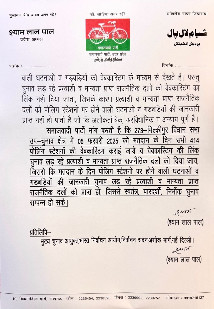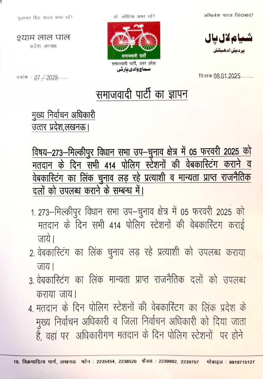 समाजवादी पार्टी ने उत्तर प्रदेश के मुख्य निर्वाचन अधिकारी को ज्ञापन सौंपकर 5 फरवरी 2025 को होने वाले मिल्कीपुर विधानसभा उपचुनाव के सभी 414 मतदान केंद्रों पर वेबकास्टिंग की मांग की है.