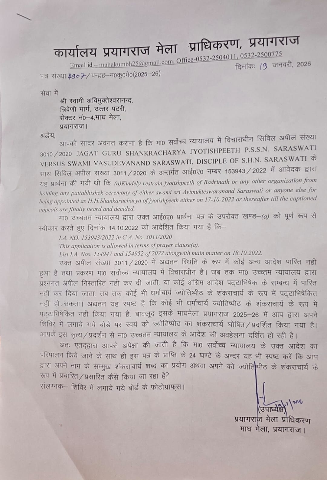 सुप्रीम कोर्ट के इसी आदेश का हवाला देते हुए मेला प्राधिकरण का कहना है कि स्वामी अविमुक्तेश्वरानंद ने खुद को गलत ढंग से शंकराचार्य घोषित किया. मेला प्राधिकरण के द्वारा सुप्रीम कोर्ट के इस निर्देश पर विभिन्न अधिवक्ताओं के द्वारा दी गई विधिक राय का भी हवाला दिया गया है. जिसमें ज्योतिष पीठ बद्रीनाथ के उत्तराधिकारी के तौर पर स्वामी अविमुक्तेश्वरानंद को कोई भी जमीन आवंटन करने पर मना किया गया है.