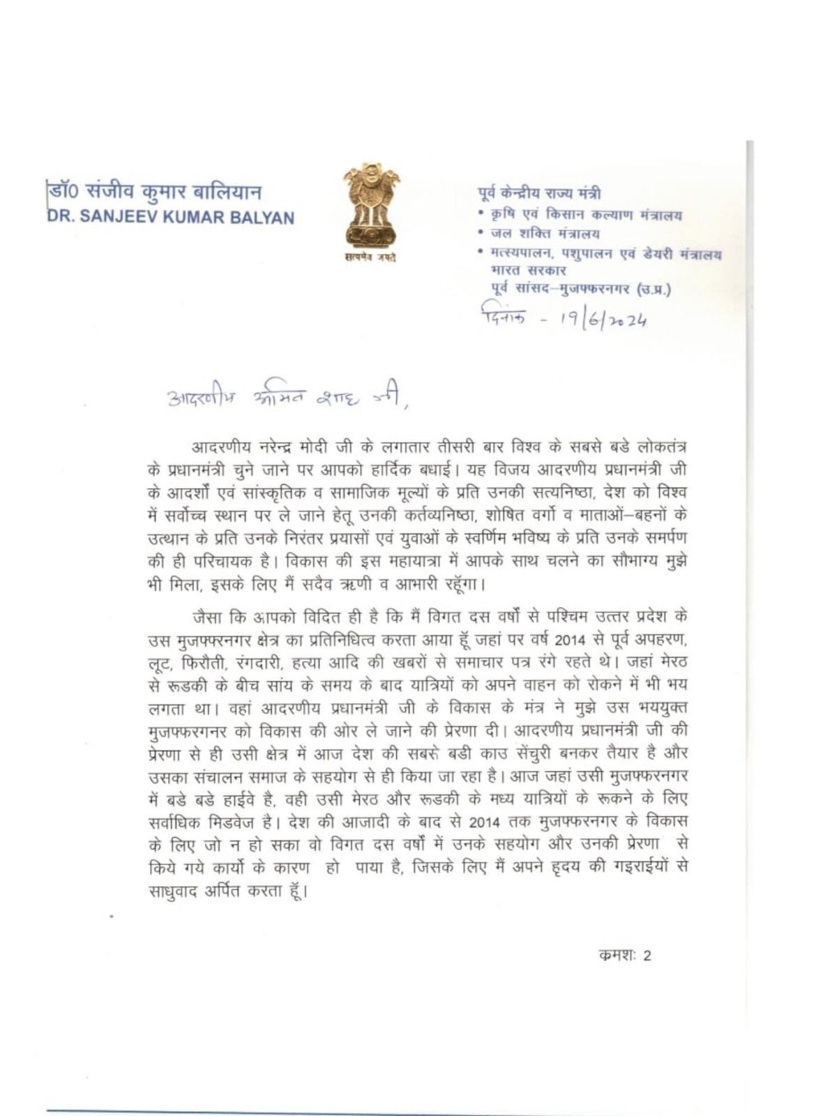 उन्होंने चिट्ठी में आगे लिखा, 'जैसा कि आपको विदित है कि मैं विगत 10 वर्षों से पश्चिम उत्तर प्रदेश के उस मुजफ्फरनगर क्षेत्र का प्रतिनिधित्व करता आया हूं. जहां पर साल 2014 से पूर्व अपहरण, लूट, फिरौती, रंगदारी, हत्या आदि की खबरों से समाचार पत्र रंगे रहते थे. जहां मेरठ से रूड़की के बीच शाम के समय के बाद यात्रियों को अपने वाहन को रोकने में भी भय लगता था. वहां प्रधानमंत्री के विकास के मंत्र ने मुझे उस भययुक्त मुजफ्फरगनर को विकास की ओर ले जाने की प्रेरणा दी.'