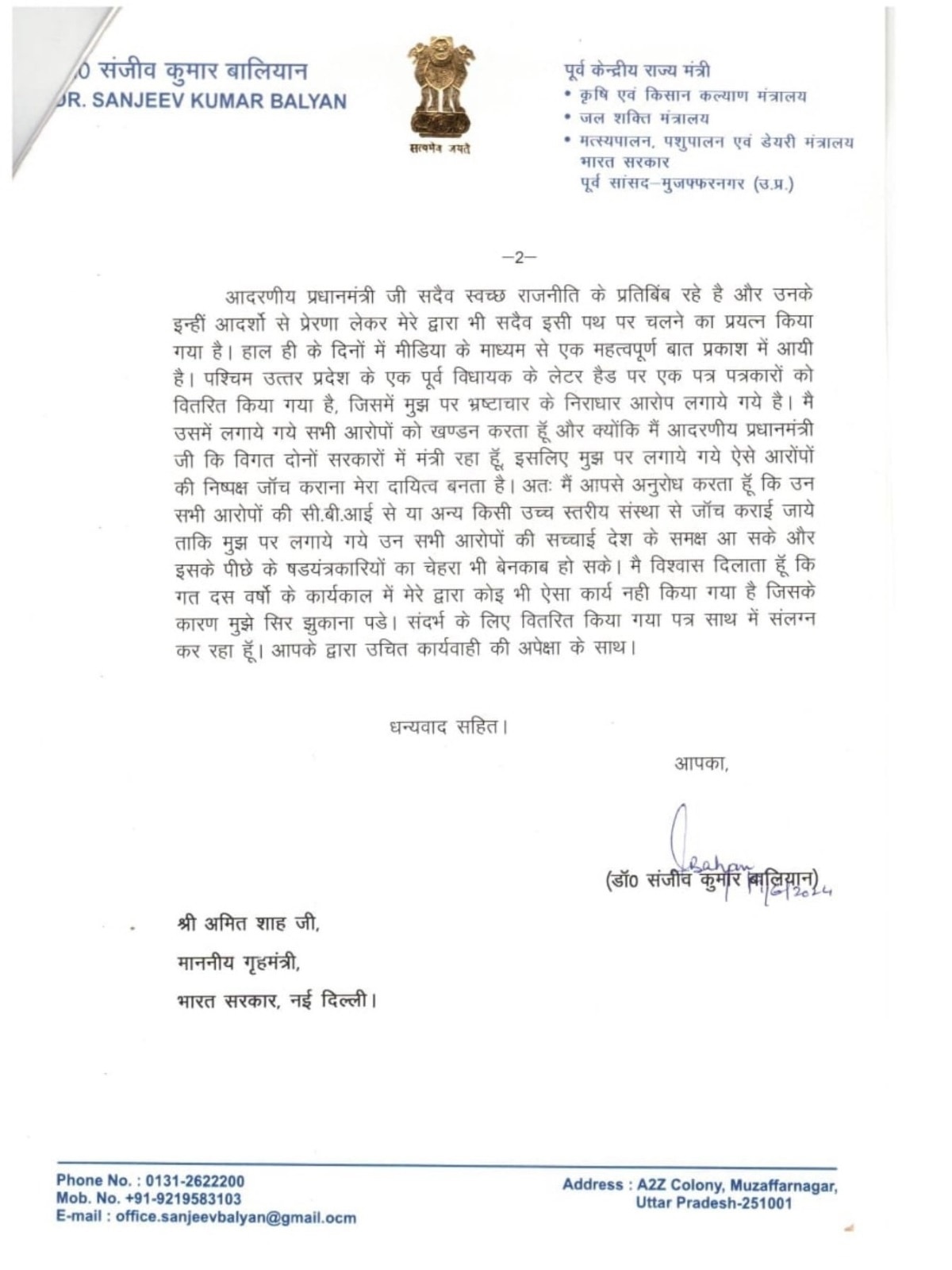 पूर्व केंद्रीय मंत्री संजीव बालियान ने अमित शाह को पत्र लिखा है. उनका पत्र सोशल मीडिया पर वायरल हो गया है. बालियान ने खुद पर लगे आरोपों की सीबीआई या उच्च स्तरीय जांच कराने की मांग की है. संगीत सोम ने संजीव बालियान पर गंभीर आरोप लगाए हैं.