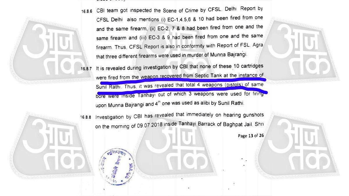 सीबीआई ने CFSL दिल्ली के साथ मौके का मुआयना किया था. सबूत इकट्ठे करने के बाद रिपोर्ट सबमिट की गई. चार्जशीट में दावा किया गया कि पूर्वांचल के माफिया मुन्ना बजरंगी को मारने में 4 असलहे (7.62 एमएम बोर) बैरक में ही थे. तीन असलहों से गोली मारी गई थी, जबकि चौथे को घटना के बाद माफिया सुनील राठी ने फेंक दिया था. राठी ही मुन्ना बजरंगी मर्डर केस में मुख्य अभियुक्त है.