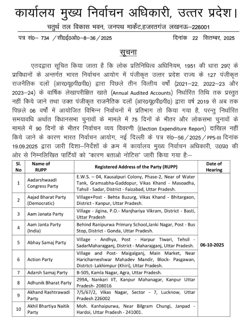 लोक प्रतिनिधित्व अधिनियम 1951 के तहत नोटिस भेजकर पिछले तीन वर्ष के खाते मांगे हैं, जिनका ऑडिट हो चुका हो. यूपी के मुख्य निर्वाचन अधिकारी कार्यालय ने इन 127 दलों को लोकसभा चुनाव के खर्च का ब्यौरा नहीं देने के लिए कारण बताओ नोटिस भी जारी किया है. यह नोटिस 19 भारत निर्वाचन आयोग की ओर से 19 सितंबर को जारी गाइडलाइन के मुताबिक जारी किया गया है.