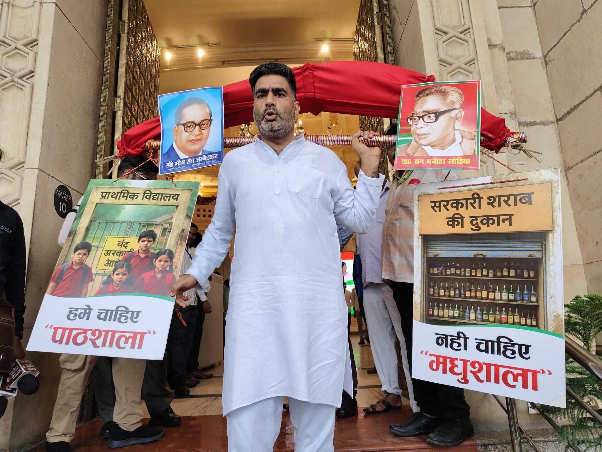 आपको बता दें कि अतुल प्रधान के कंधे पर जो कांवड़ थी, उसमें एक तरफ सरकारी स्कूल व बच्चों की तस्वीर लटक रही थी, जबकि दूसरी तरफ सरकारी शराब की दुकान की तस्वीर लटक रही थी. वहीं, ऊपर डंडे पर आंबेडकर जी और लोहिया जी की फोटो लगा रखी थी.