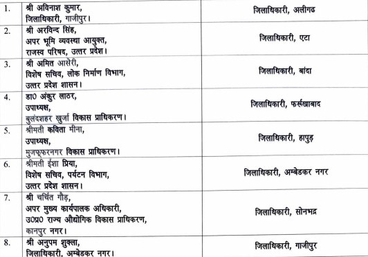 अमित आसेरी को बांदा, अंकुर लाठर को फर्रूखाबाद, कविता मीना को हापुड़, ईशा प्रिया को अम्बेडकर नगर, चर्चित गौड़ को सोनभद्र का डीएम बनाया गया है.