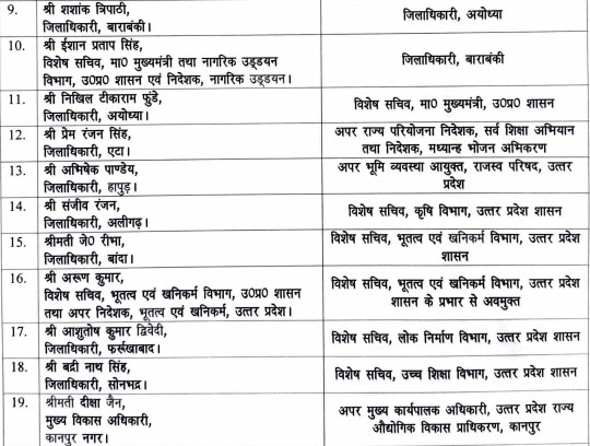 ट्रांसफर के तहत कई अधिकारियों को नए जिलों की जिम्मेदारी सौंपी गई है, जबकि कुछ को महत्वपूर्ण विभागों में तैनाती दी गई है. अविनाश कुमार अब गाजीपुर की जगह अलीगढ़ के डीएम होंगे. अरविंद सिंह (अपर भूमि व्यवस्था आयुक्त, राजस्व परिषद) को एटा जिलाधिकारी की जिम्मेदारी सौंपी गई है.