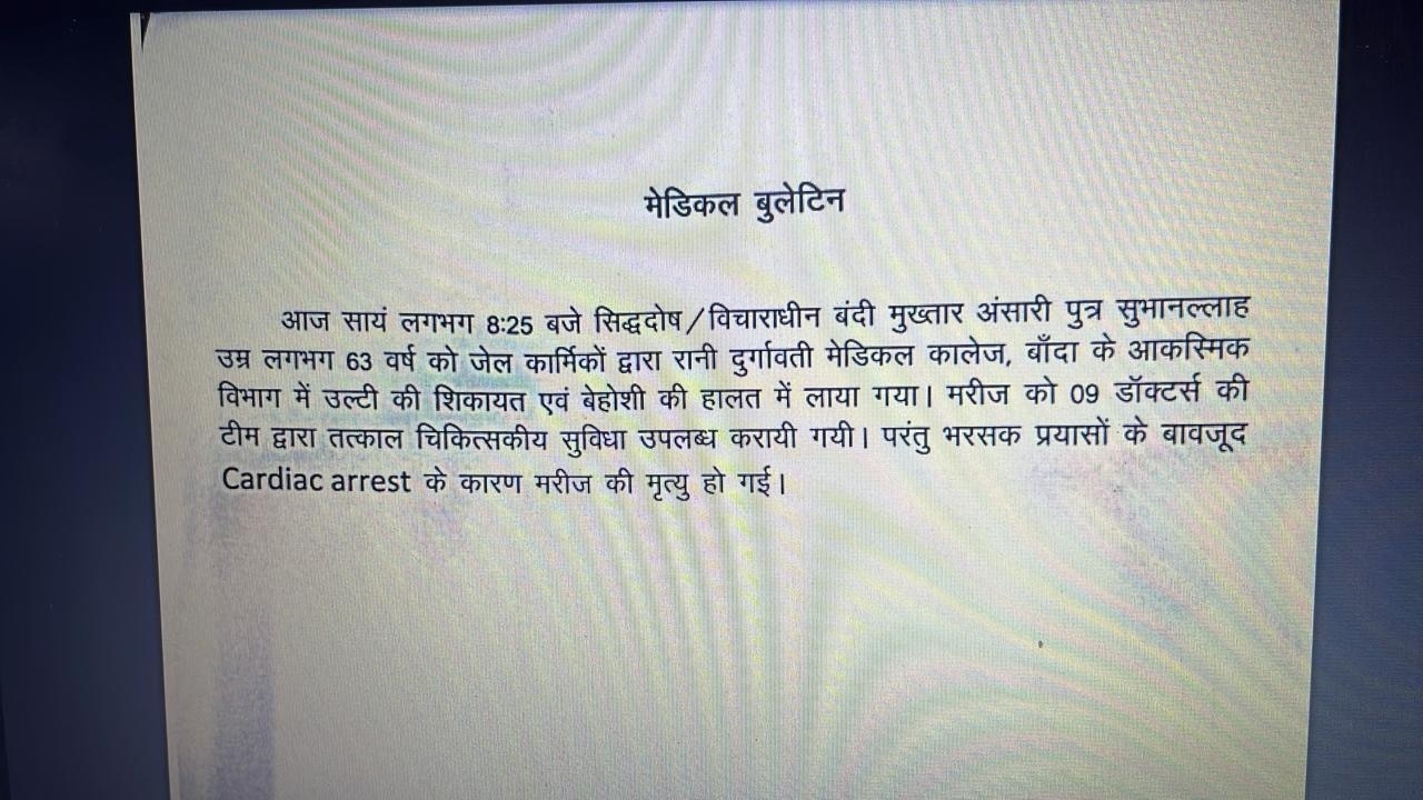 मेडिकल बुलेटिन में बताया गया कि शाम को लगभग 8:25 बजे मुख्तार अंसारी (63) को जेल कार्मिकों द्वारा रानी दुर्गावती मेडिकल कॉलेज, बांदा के आकस्मिक विभाग में उल्टी की शिकायत एवं बेहोशी की हालत में लाया गया. मरीज को 9 डॉक्टर्स की टीम द्वारा तत्काल चिकित्सकीय सुविधा उपलब्ध कराई गई. परंतु भरसक प्रयासों को बावजूद कार्डियक अरेस्ट के कारण मरीज की मृत्यु हो गई.
