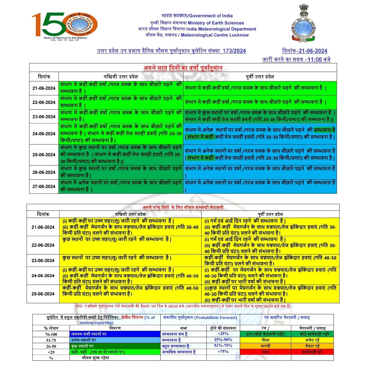 हालांकि पूर्वी यूपी में अब लू की स्थिति पूरी तरह खत्म हो चुकी है. लेकिन आज, 22 जून को यहां गर्म दिन रहने की संभावना है. इसके बाद 23 जून से कुछ इलाकों में तेज हवाएं और हल्की बारिश शुरू हो जाएगी. जबकि 24 जून से 27 जून तक यहां के ज्यादातर इलाकों में बारिश शुरू हो जाएगी. वहीं कुछ इलाकों में तेज बारिश हो सकती है. यानी इन दौरान उत्तर प्रदेश की सीमा में मॉनसून प्रदेश कर चुका होगा.