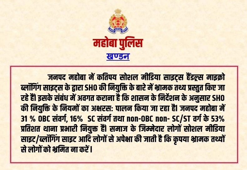 महोबा में, 13 थानों में 7 सामान्य, 4 ओबीसी और 2 अनुसूचित जाति जनजाति के थानेदार हैं। सामान्य श्रेणी के 7 थानों में 6 ठाकुर और 1 ब्राह्मण थानेदार हैं.
