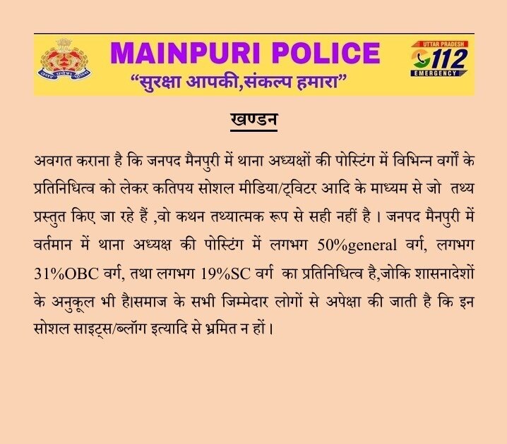 मैनपुरी में, कुल 16 थानों में 8 सामान्य श्रेणी के हैं, जबकि 5 ओबीसी और 3 अनुसूचित जाति जनजाति के थानेदार हैं. इस जिले में 8 सामान्य श्रेणी के थानों में 5 ठाकुर और 3 ब्राह्मण तैनात हैं.