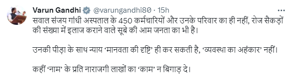 भारतीय जनता पार्टी (BJP) के सांसद वरुण गांधी ने एक मरीज की मौत के बाद अमेठी के संजय गांधी अस्पताल का लाइसेंस निलंबित करने को लेकर शनिवार को प्रदेश में अपनी ही पार्टी की सरकार पर कटाक्ष किया. सोशल मीडिया प्लेटफॉर्म एक्स पर वरुण गांधी ने लिखा, “सवाल 450 श्रमिकों के परिवारों का नहीं है, बल्कि राज्य (उत्तर प्रदेश) के सैकड़ों आम लोगों का भी है. उनकी पीड़ा का न्याय केवल मानवता की दृष्टि ही कर सकती है, व्यवस्था का अहंकार' नहीं.' ऐसा न हो कि 'नाम' के प्रति नाराजगी लाखों लोगों का 'काम' खराब कर दे."