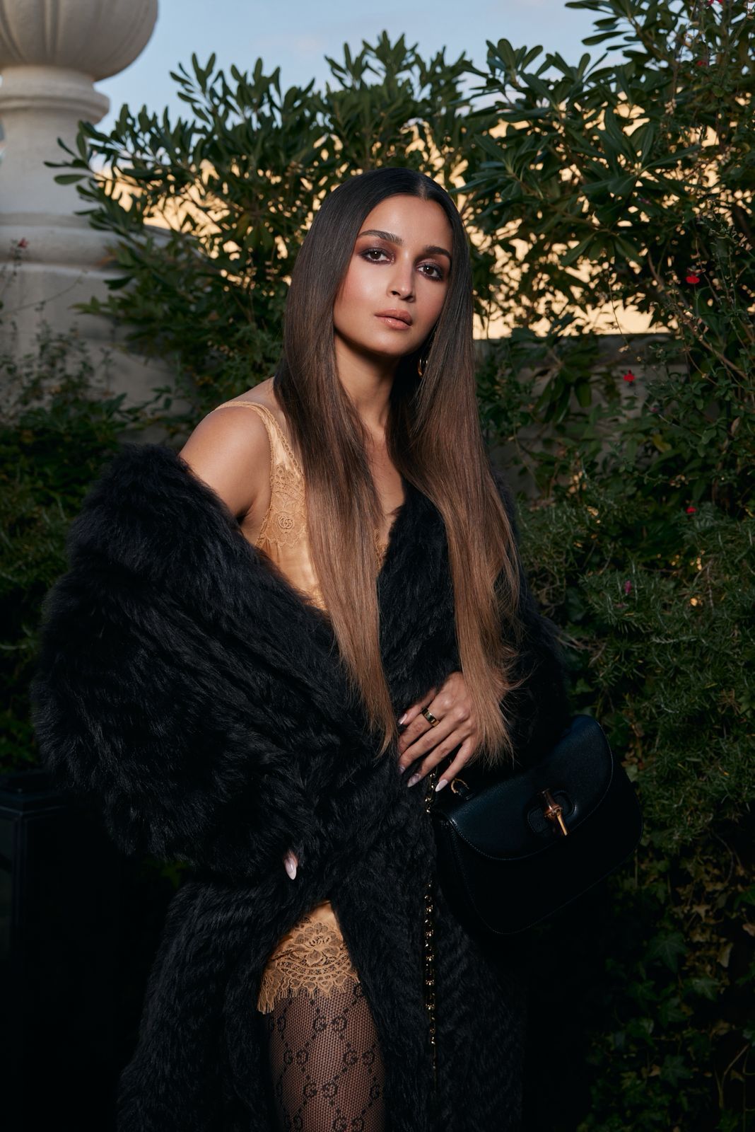 मिलान फैशन वीक में Gucci के डेमना के स्प्रिंग/समर कलेक्शन 2026 का डेब्यू हुआ. इसमें आलिया ने शेव्रॉन पैटर्न वाला लॉन्ग फर कोट और लेस स्टॉकिंग और साटन स्लिप ड्रेस पहनी थी.
