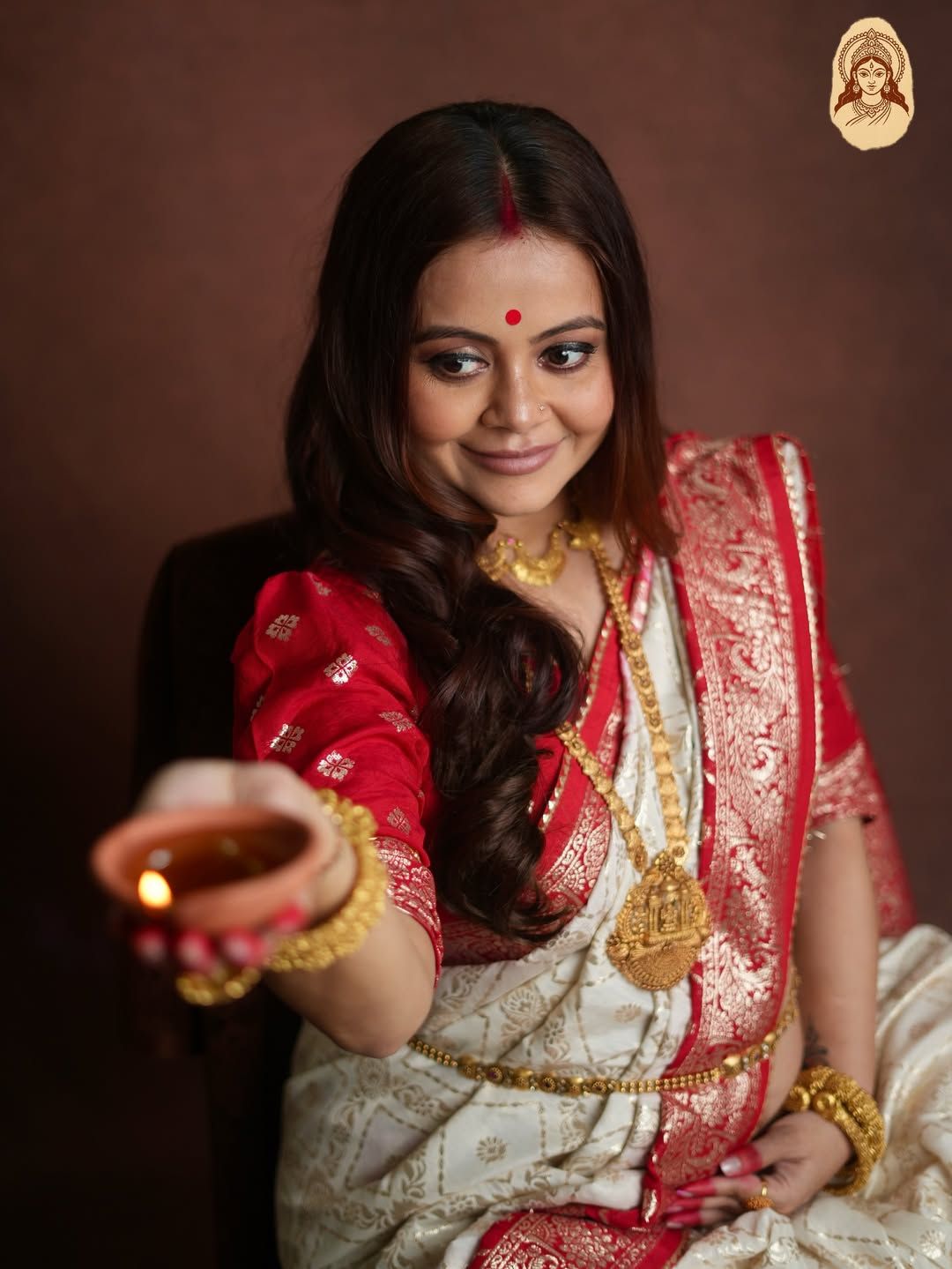 एक हाथ में दीया पकड़ा हुआ है और दूसरे हाथ से अपनी बेली को थामा हुआ है. देखकर ऐसा लगता है कि देवोलीना दूसरी बार मां बनने वाली हैं.