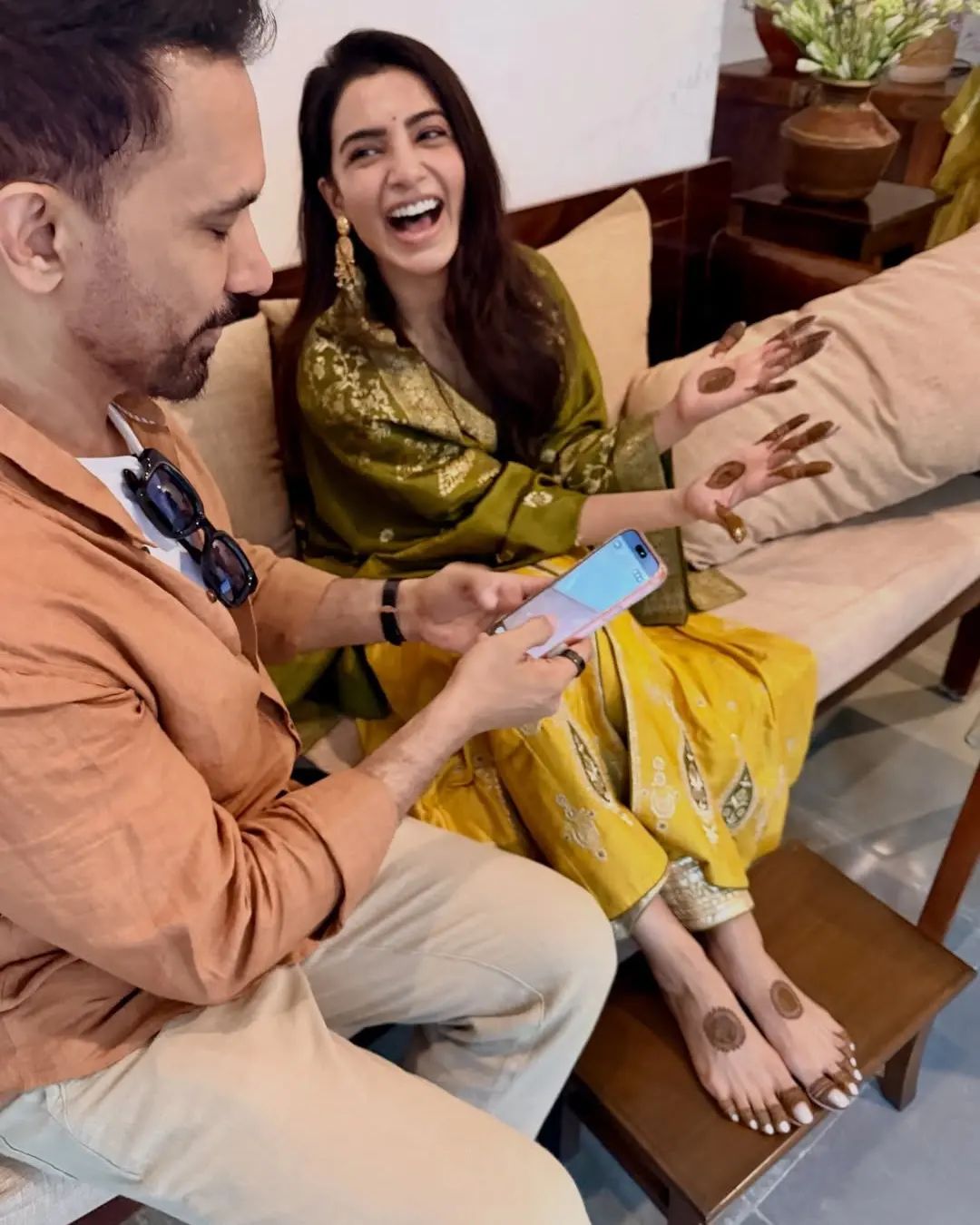 सोशल मीडिया पर समांथा की मेहंदी की तस्वीरें भी वायरल होने लगी हैं. देखा जा सकता है कि एक्ट्रेस ने ग्रीन सिम्पल सूट पहना हुआ है.