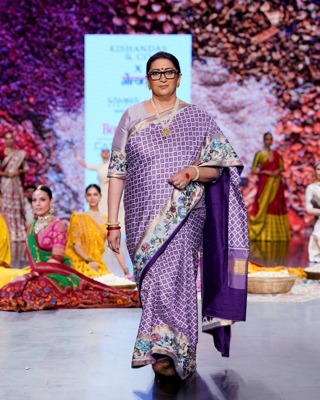 स्मृति ईरानी ने बॉम्बे टाइम्स फैशन वीक में रैंप वॉक की. वो डिजाइनर गौरांग शाह के लिए शोस्टॉपर बनी थीं. उन्होंने खूबसूरत पर्पल साड़ी पहने रैंप वॉक की.