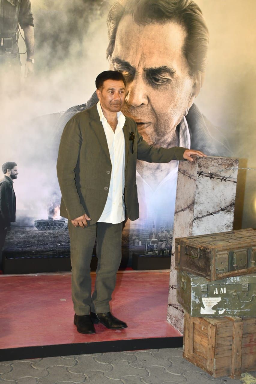 स्क्रीनिंग से पहले सनी देओल ने पैप्स को पोज दिए. फिर वो अपने बैकग्राउंड में लगी पापा की फोटो के सामने जाकर खड़े हुए.